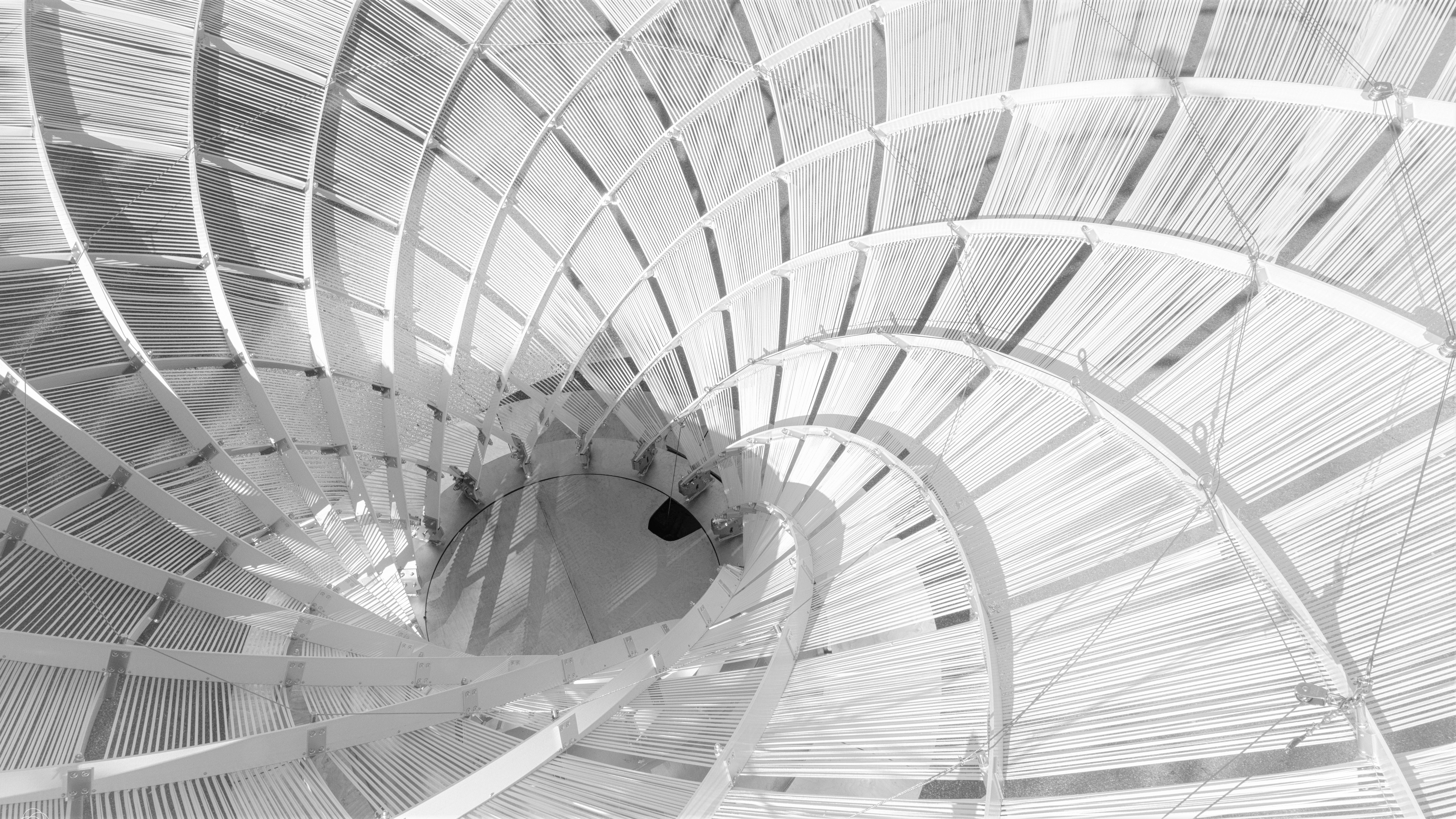 Die Konstruktion besteht aus 32 schlanken Glasfaserlamellen (8 x 80 mm), die durch Scherengelenke aufrecht miteinander verbunden sind. Dieses Gitter weist eine außergewöhnliche Widerstandsfähigkeit gegenüber externen Lasten auf, während es sich gleichzeitig gezielt verformen lässt. Mithilfe von Ringseilen und Winden kann der sechs Meter hohe Zylinder in einen auskragenden Trichter mit einer Spannweite von acht Metern überführt werden. Während dieser Transformation öffnet sich das diagonale Lamellengitter und spannt eine textile Membran als Sonnenschutz auf.