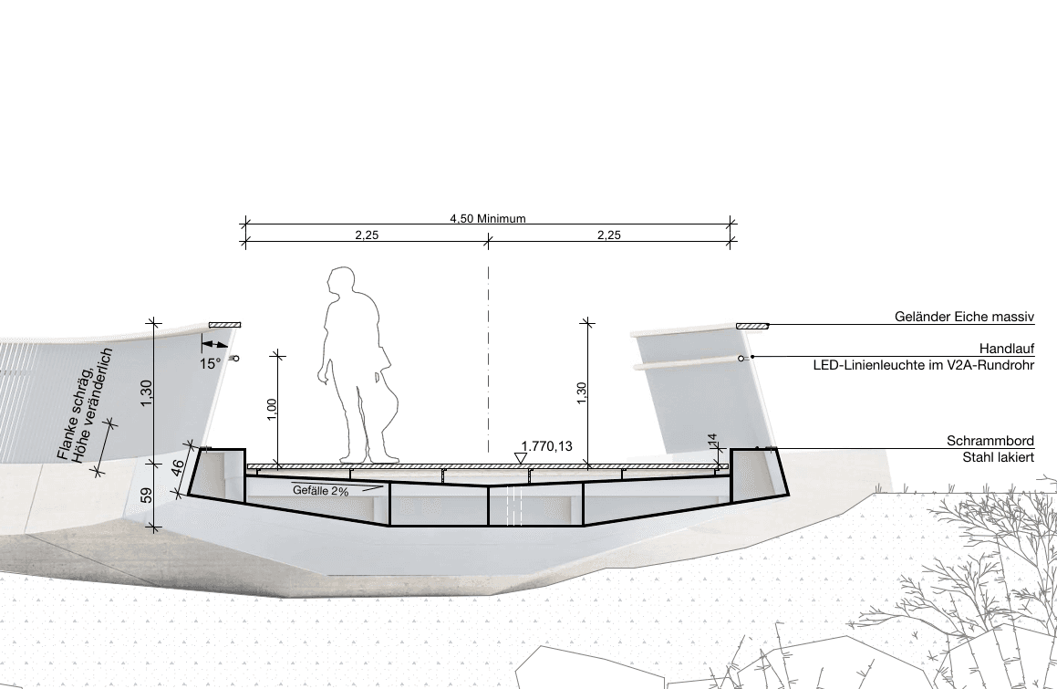 Die höchste Beanspruchung tritt an den Auflagern auf, wo Biegung, Torsion und Schubkräfte durch die Grundrisskrümmung entstehen. Hier ist das Querschnittsprofil verstärkt und verjüngt sich mit abnehmender Belastung. Verformungen werden durch konstruktive Maßnahmen begrenzt, sodass auch strenge statische Anforderungen erfüllt werden. Der Entwurf verbindet so technische Präzision mit ästhetischer Eleganz und unterstreicht den internationalen Anspruch des Tourismusgebiets.