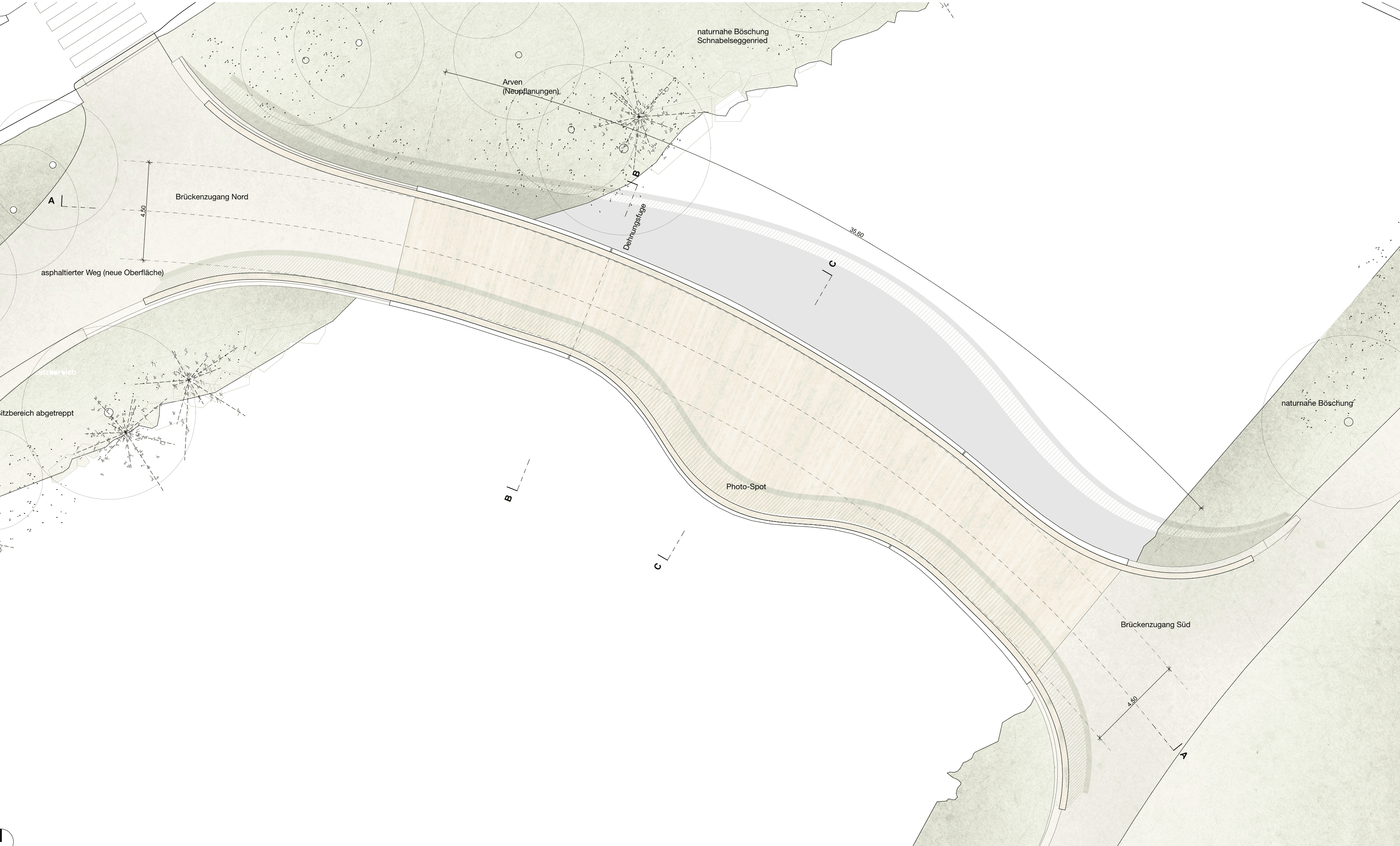 Der Entwurf für die Brücke am St. Moritzersee ist ein Wettbewerbsbeitrag der 2. Runde, der durch eine harmonische Verbindung von eleganter Formensprache und technischer Innovation überzeugt. Die Brücke ist als fließende, naturnahe Struktur konzipiert, die sich mit ihren kurvenreichen Linien in die spektakuläre Landschaft einfügt und gleichzeitig Raum für verschiedene Bewegungsströme bietet – vom schnellen Radverkehr bis zum entspannten Verweilen.